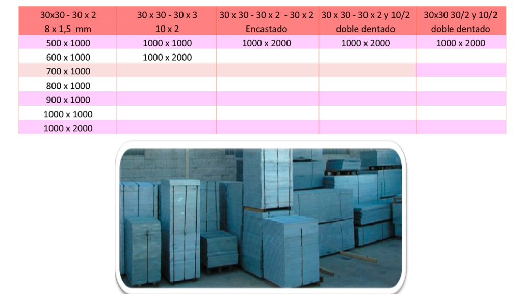 Formatos estándar: 2000 x 1000, 2500 x 1250, 3000 x 1500, 6000 x 1500, 3000 x 2000 y 6000 x 2000 mm.