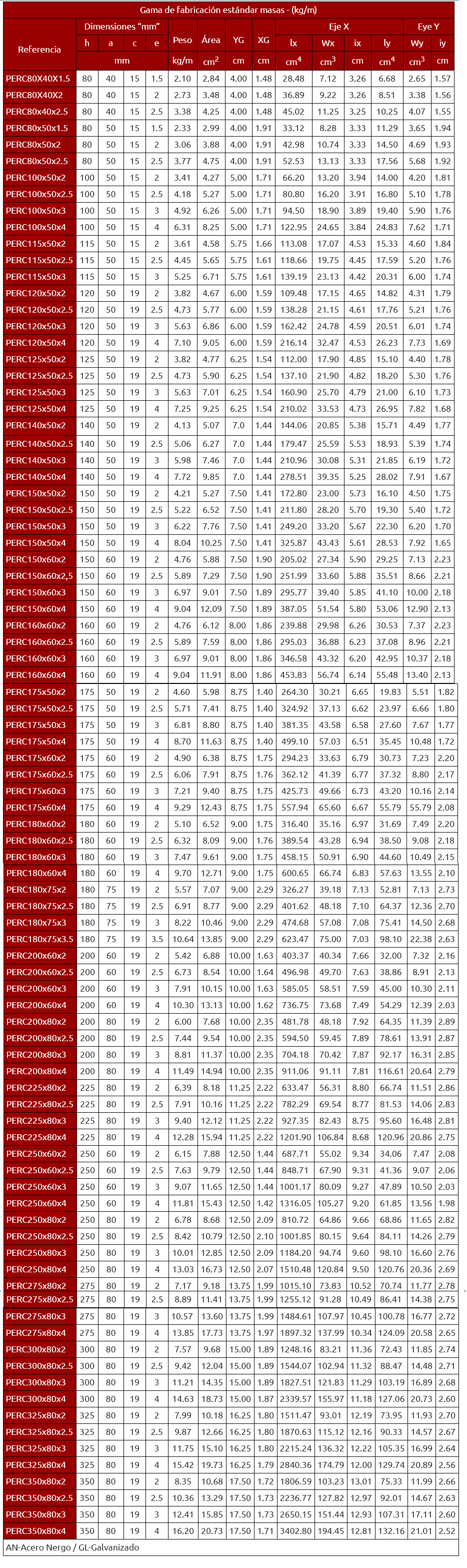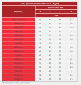 | Espesor (mm) | Altura (mm) | Peso por metro (kg) | Lamas por metro de altura | Acabado |